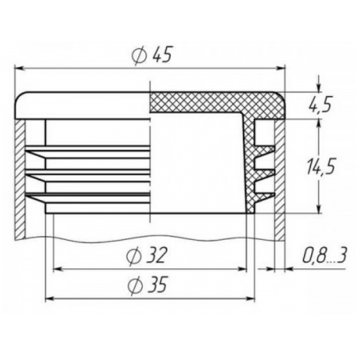 Пластикова заглушка діаметром 45 мм підходить для труби з круглою формою перерізу з товщиною стінки 0,8 - 1,5 мм.