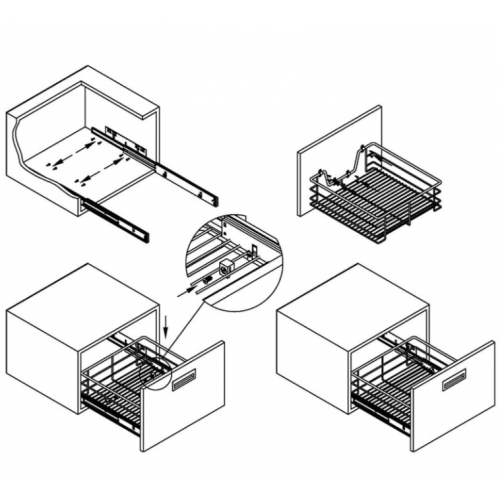 Кошик встановлюється у модуль шириною 400 мм та глибиною від 425 мм. Кріпиться до фасаду. У комплект входять напрямні, кріплення.