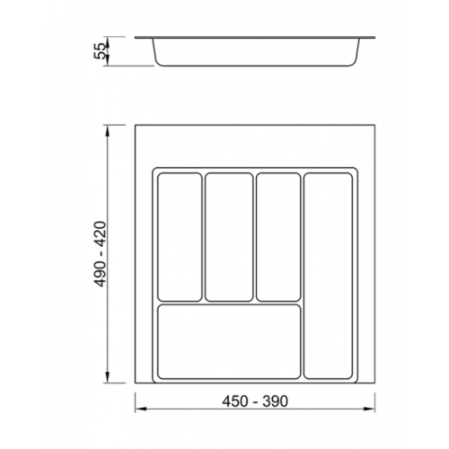 Лоток для столових приладів містить кілька секцій для зберігання кухонного приладдя. Зручний тим, що дозволяє сортувати столові прилади по секціях. Така організація зберігання в лотку є дуже зручною, особливо коли на кухні багато приладів. Розмір лотка можна регулювати під розмір шафи за допомогою обрізки непотрібної частини лотка (довжина, мм: 420 - 490), (ширина, мм: 390 - 450).