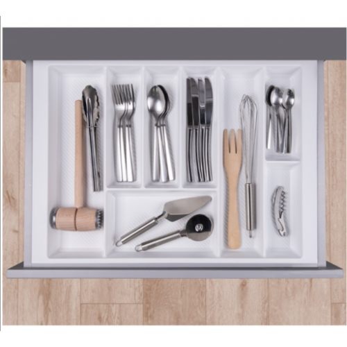 Лоток для столових приладів містить кілька секцій для зберігання кухонного приладдя. Зручний тим, що дозволяє сортувати столові прилади по секціях. Така організація зберігання в лотку є дуже зручною, особливо коли на кухні багато приладів. Розмір лотка можна регулювати під розмір шафи за допомогою обрізки непотрібної частини лотка (довжина, мм: 420 - 490), (ширина, мм: 390 - 450).