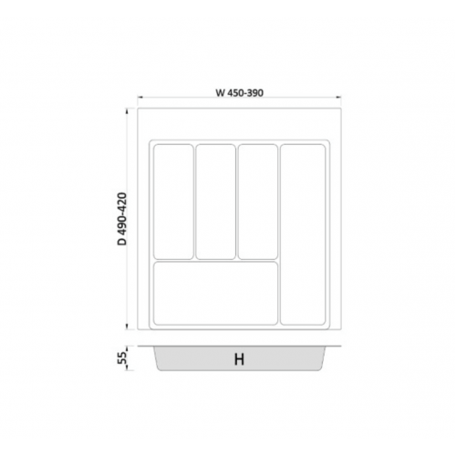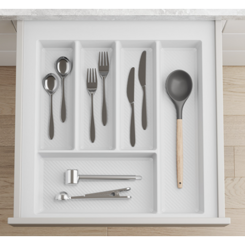 Лоток для столових приладів містить кілька секцій для зберігання кухонного приладдя. Зручний тим, що дозволяє сортувати столові прилади по секціях. Така організація зберігання в лотку є дуже зручною, особливо коли на кухні багато приладів. Розмір лотка можна регулювати під розмір шафи за допомогою обрізки непотрібної частини лотка (довжина, мм: 420 - 490), (ширина, мм: 390 - 450).