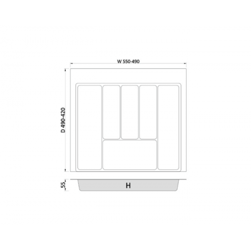 Лоток для столових приладів містить кілька секцій для зберігання кухонного приладдя. Зручний тим, що дозволяє сортувати столові прилади по секціях. Така організація зберігання в лотку є дуже зручною, особливо коли на кухні багато приладів. Розмір лотка можна регулювати під розмір шафи за допомогою обрізки непотрібної частини лотка (довжина, мм: 420 - 490), (ширина, мм: 490 - 550).