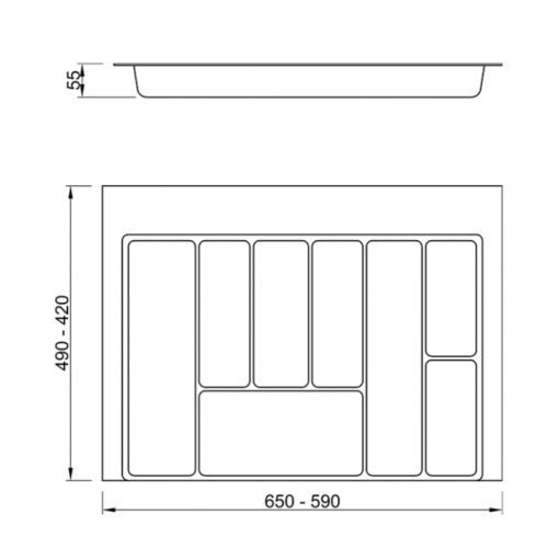 Лоток для столових приладів містить кілька секцій для зберігання кухонного приладдя. Зручний тим, що дозволяє сортувати столові прилади по секціях. Така організація зберігання в лотку є дуже зручною, особливо коли на кухні багато приладів. Розмір лотка можна регулювати під розмір шафи за допомогою обрізки непотрібної частини лотка (довжина, мм: 420 - 490), (ширина, мм: 590 - 650).