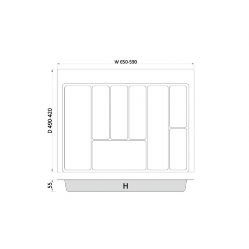 Лоток для столових приладів містить кілька секцій для зберігання кухонного приладдя. Зручний тим, що дозволяє сортувати столові прилади по секціях. Така організація зберігання в лотку є дуже зручною, особливо коли на кухні багато приладів. Розмір лотка можна регулювати під розмір шафи за допомогою обрізки непотрібної частини лотка (довжина, мм: 420 - 490), (ширина, мм: 590 - 650).