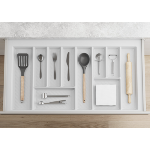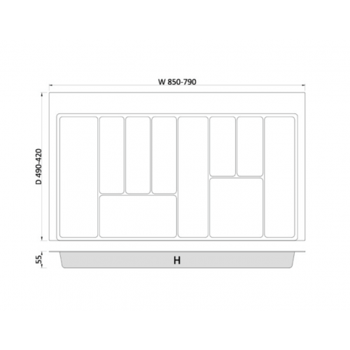 Лоток для столових приладів містить кілька секцій для зберігання кухонного приладдя. Зручний тим, що дозволяє сортувати столові прилади по секціях. Така організація зберігання в лотку є дуже зручною, особливо коли на кухні багато приладів. Розмір лотка можна регулювати під розмір шафи за допомогою обрізки непотрібної частини лотка (довжина, мм: 420 - 490), (ширина, мм: 790 - 850).
